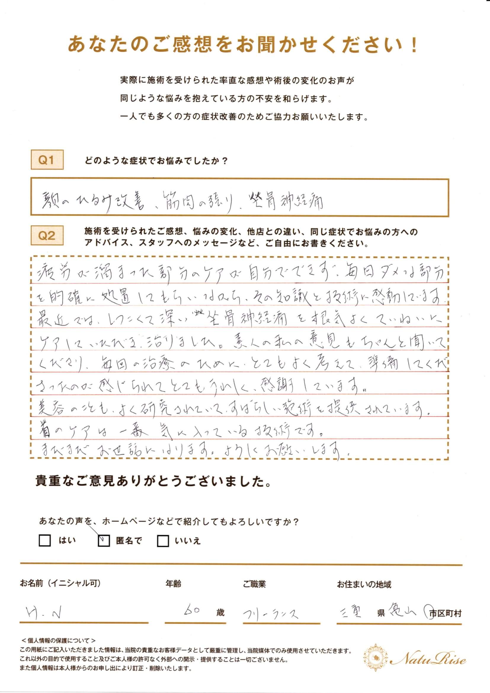 素人の私の意見もちゃんと聞いて くださり、毎回の治療のために、よく考えて準備してくださっているのが感じられて、とてもうれしく感謝しています。