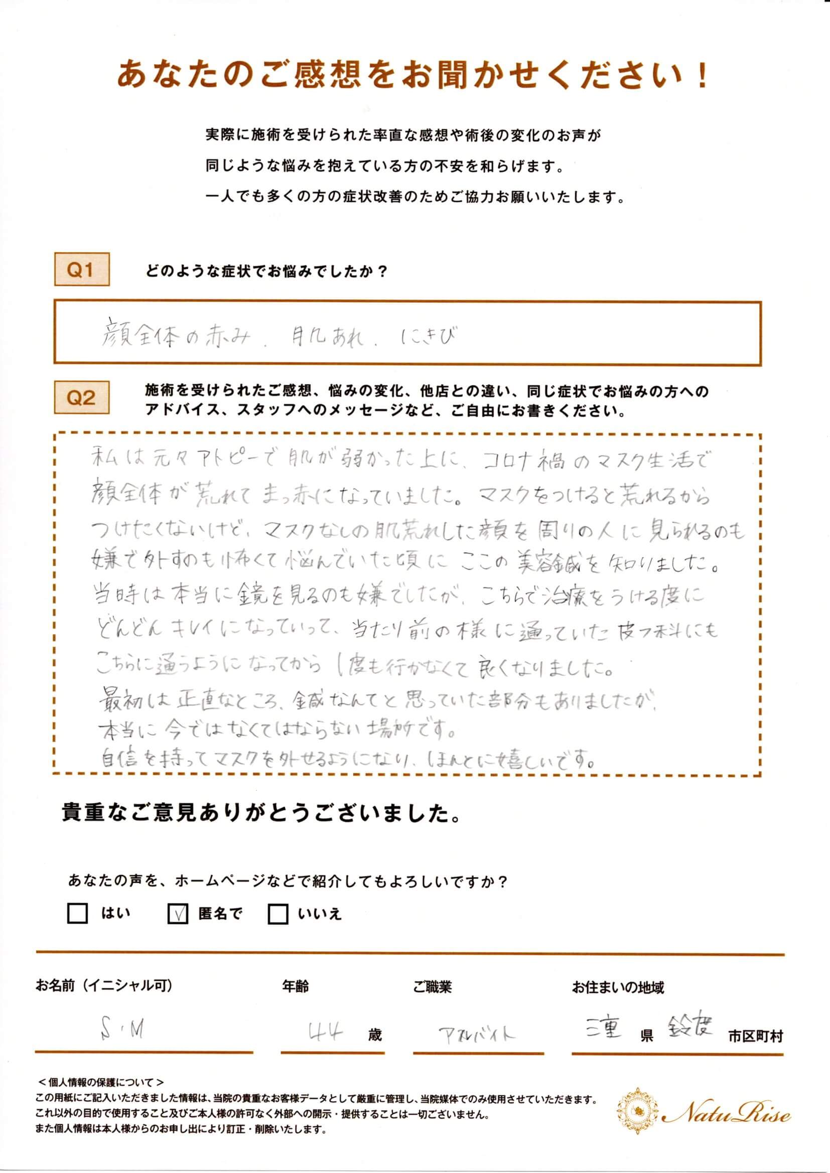当時は本当に鏡を見るのも嫌でしたが、こちらで治療をうける度にどんどんキレイになっていって、当たり前の様に通っていた皮フ科にもこちらに通うようになってから1度も行かなくて良くなりました。