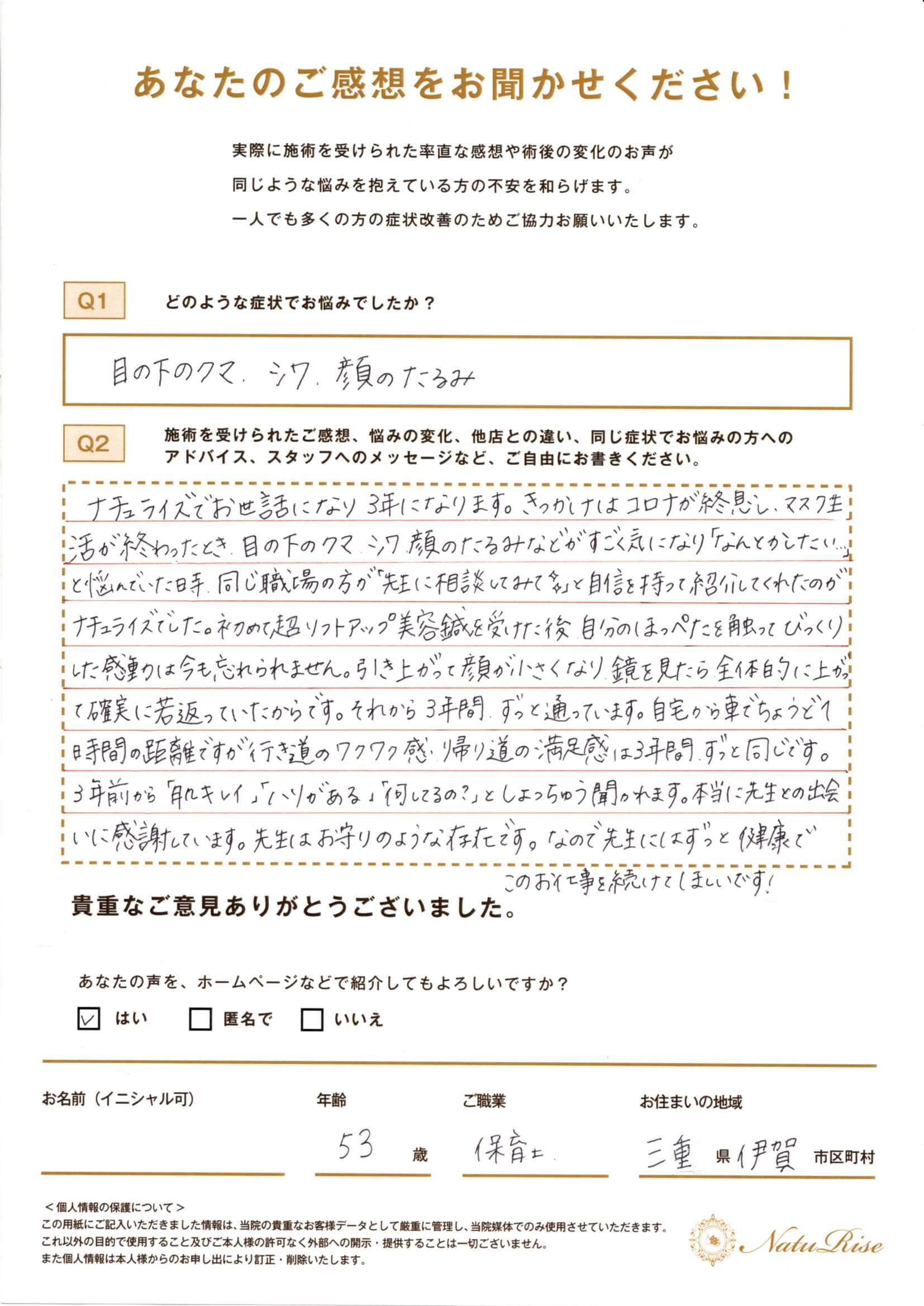 ナチュライズでお世話になり3年になります。きっかけはコロナが終息し、マスク生活が終わったとき、目の下のクマ、シワ、顔のたるみなどがすごく気になり「なんとかしたい……」 と悩んでいた時、同じ職場の方が「先生に相談してみて」と自信を持って紹介してくれたのが、 ナチュライズでした。